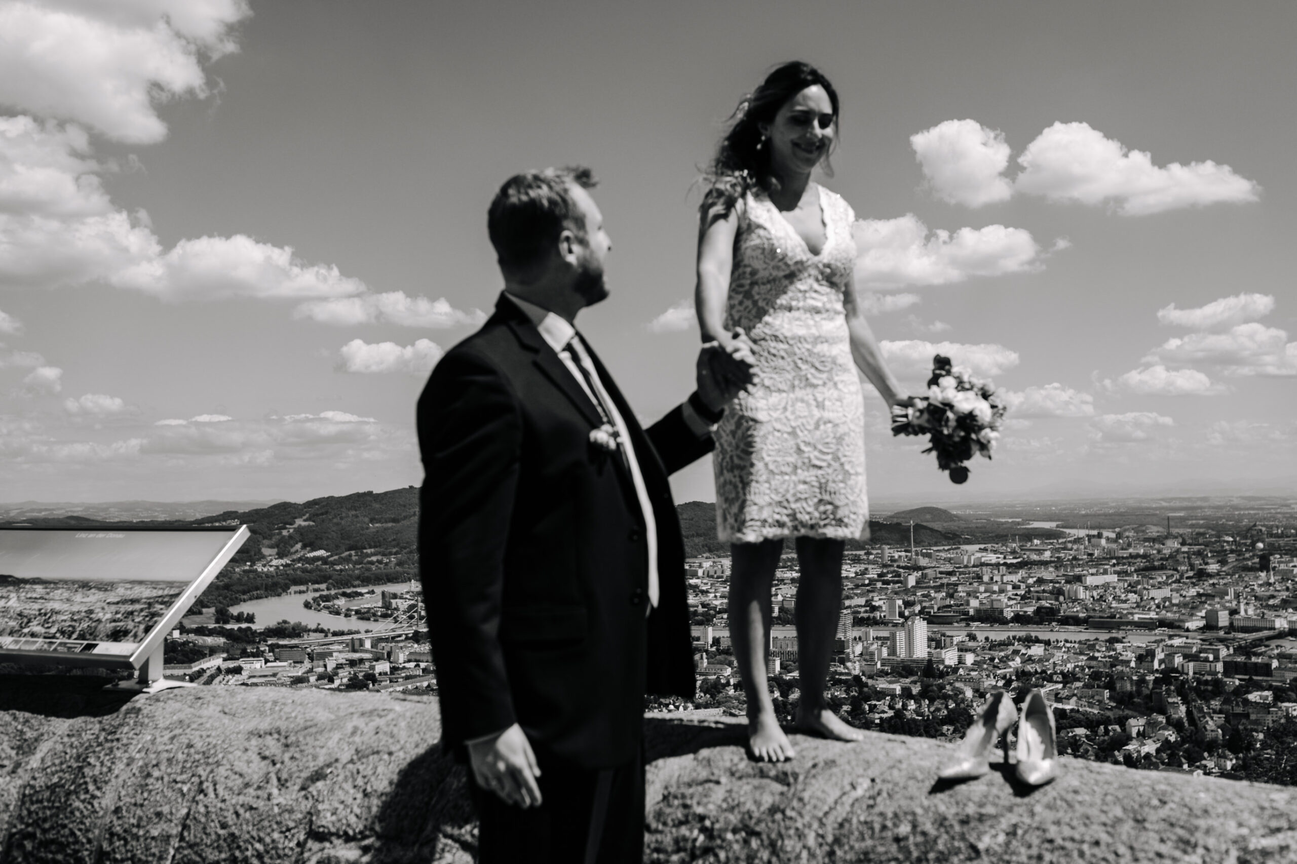 Sommer in einer Großstadt, über den Dächern der Stadt mit Anreise zur Trauung per U-Bahn. Die Fahrt mit einem Roller, einem Fahrrad oder einer Rikscha oder doch einfach zu Fuß. Ein Paarshooting quer durch die Stadt vielleicht in einer Ape von ladocevienna.at
